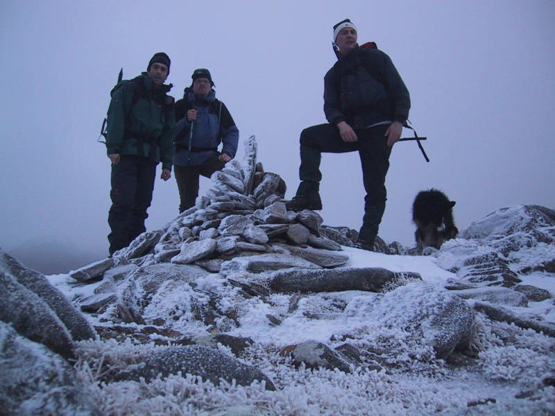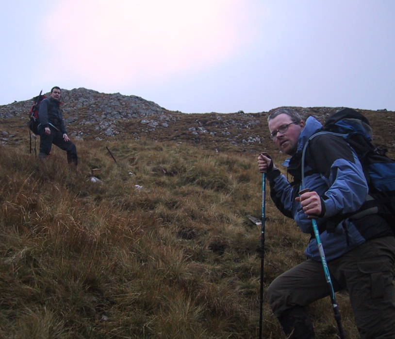 Tiime for a rest and a look back to Luinne Bhein. Hard going. Whoops no!! That hill pictured is Meall Buidhe. They all look the same. They all look the same. So that is all we still have to do before going home. That's the lochan that feeds the Alt na Seaiga on the left, and our route right across the middle into that misty bit up there. |
