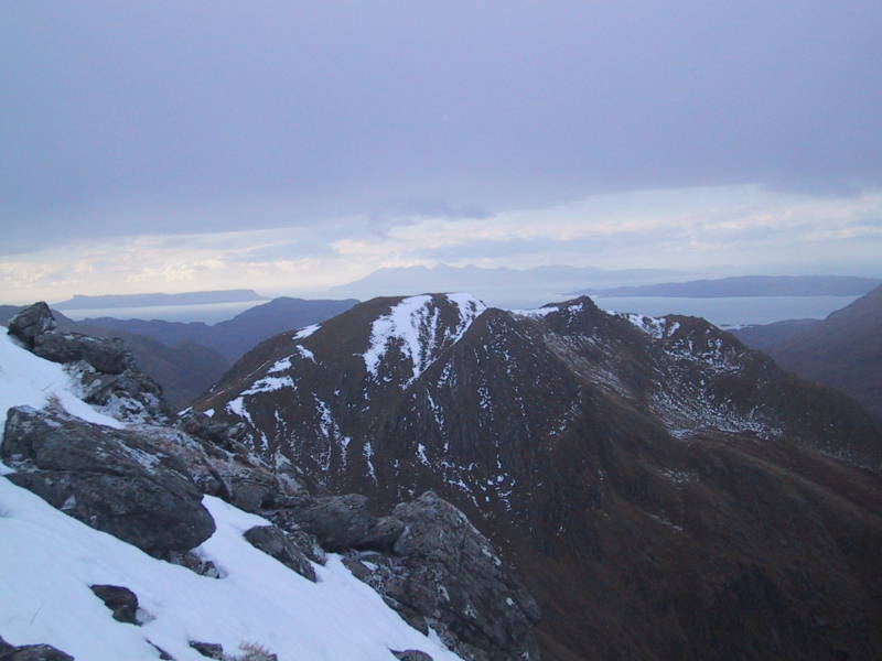 One of Kristan's calendar pictures - Stob a Chearcaill poking up on the left, as it does, and the allegedly wonderful Ladhar Bheinn on the right. |