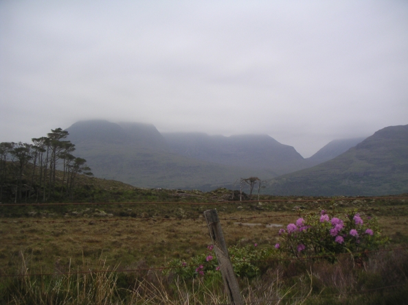 ![]() Heading up the Coire MhicNobaill - great paths again. That's Na Rathanan (The Horns of Alligin) on the right (in the mist). |