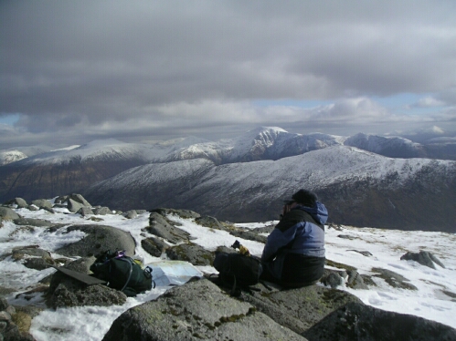And I just couldn't make this smaller. There is an even bigger version here if you are interested. As above we have Beinn Fhionnlaidh in front of Sgorr na h-Ulaidh with Bidean nam Bian behind, on the left hand side. The Anoch Eagach ridge is on the horizon to the far left. To the right of those we have the two Buachaille's (Etive Beag and EtiveMore), then Glen Etive. To the right of the centre we see Creise and Meall a'Bhuiridh, then more and more. Behind the snowy ridge on the right are Meall nan Eun and Stob Coir'an Albannaich , Ben Starav and all the rest, with Loch Etive on the far right. In the far distance I think we can see Ben More, Ben Lui , and on the far right Ben Cruachan, what a view!