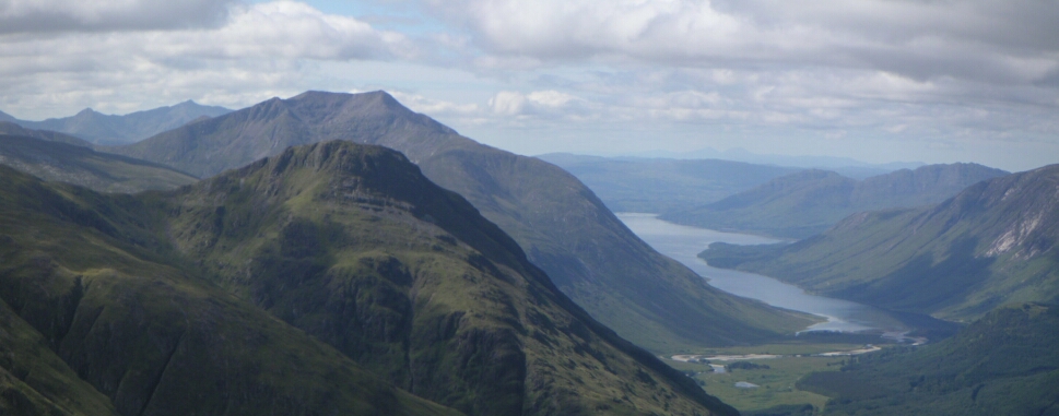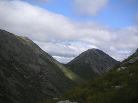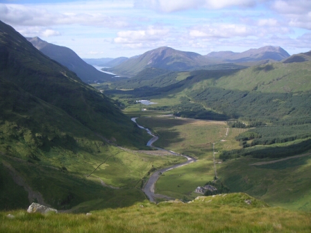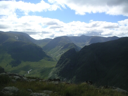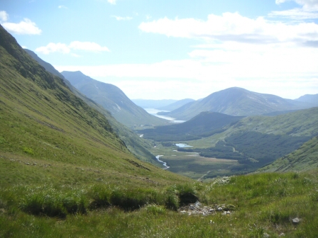 Glen Etive from the watershed of Lairig Gartain - a long walk in the hot sun. |