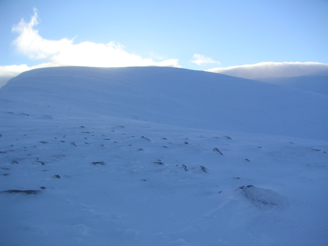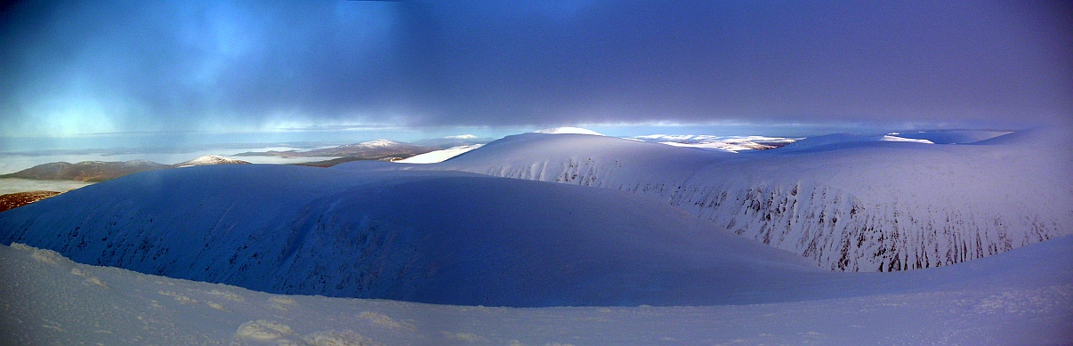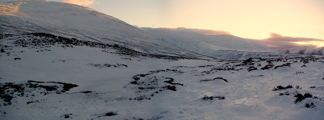 ![]() At last, a view of Ben Macdui's slopes on the left, round to Carn a'Mhaim, the Lairig Ghru, The Devil's Point, Cairn Toul, and Sgor an Lochain Uaine (The Angel's Peak). Makes it all worthwhile |