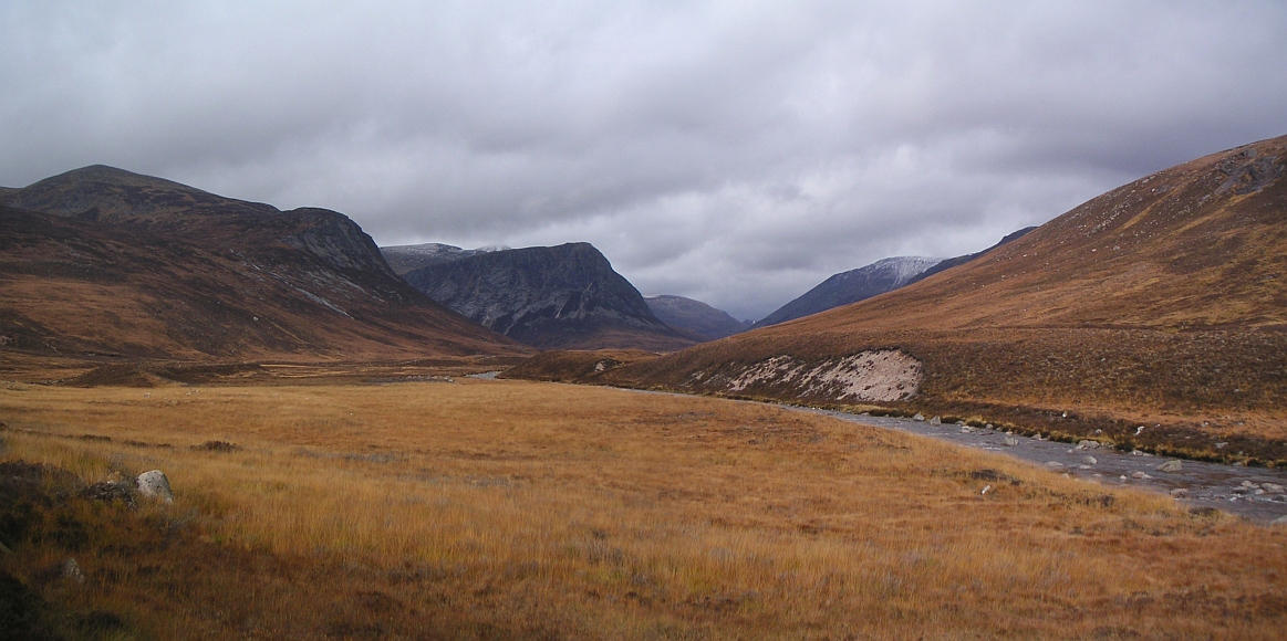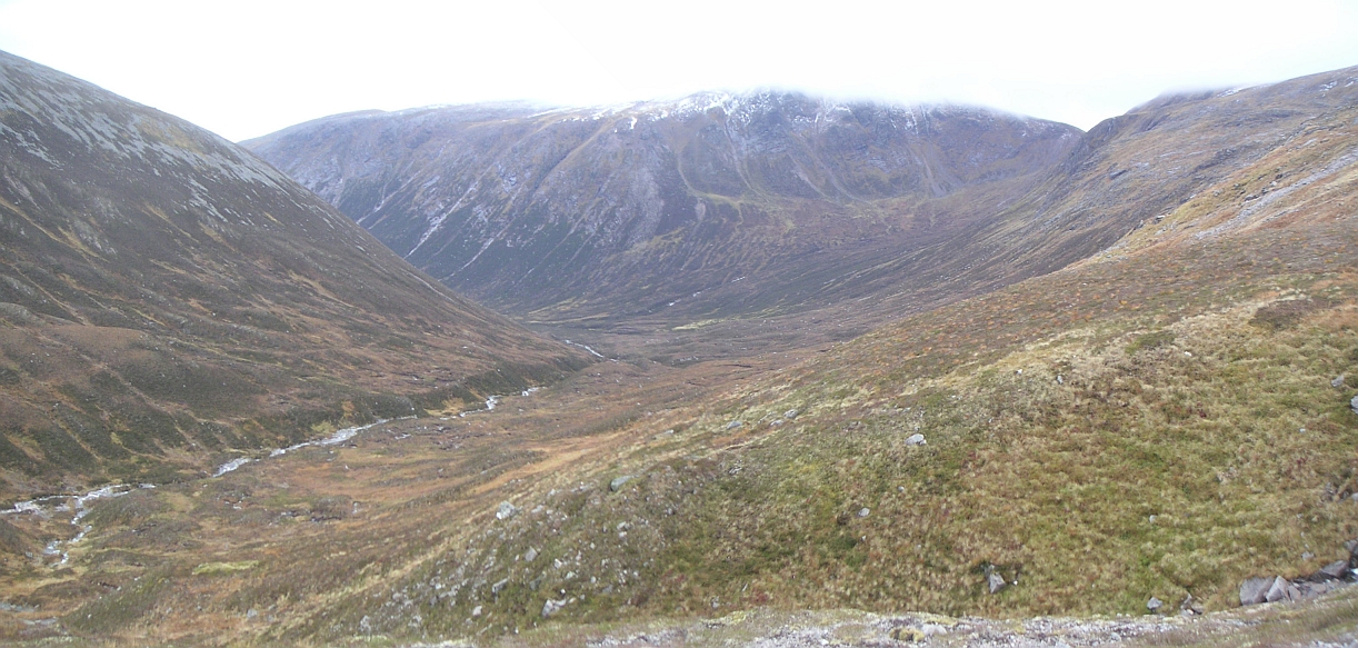 ![]() Today's route is up Glen Geusachan to the left of the Devil's Point |