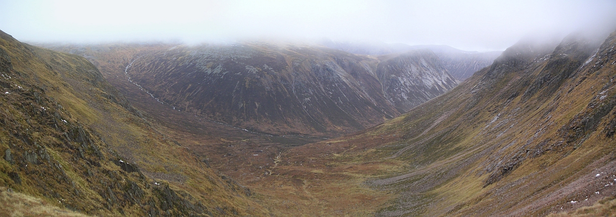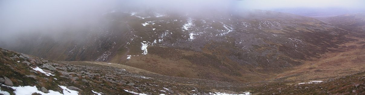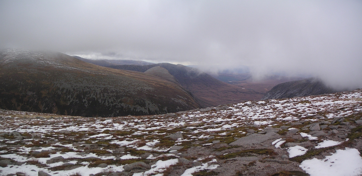 ![]() Just before hitting the clouds - can see Carn a'Mhaim behind The Devil's Point, and Derry Lodge is way down that glen in front. |