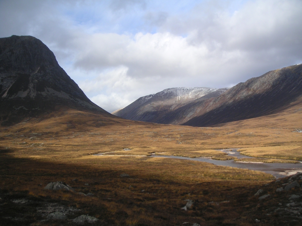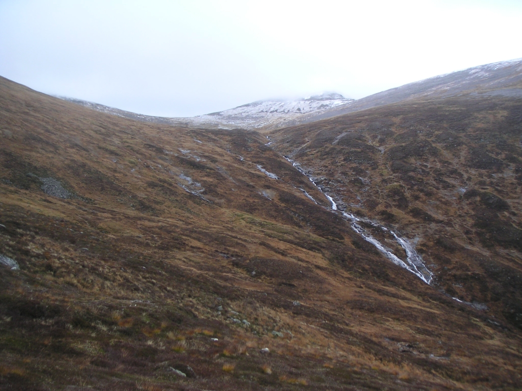 ![]() Climbing out of Glen Geusachan, a lovely little glen. Beinn Bhrotain going under the cloud (I am now on the other side of this one). |