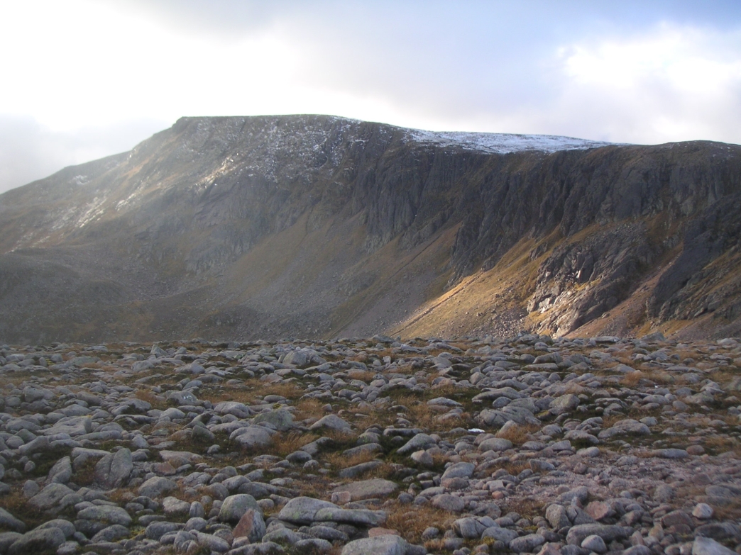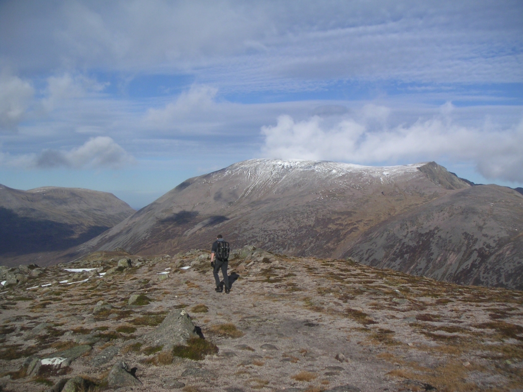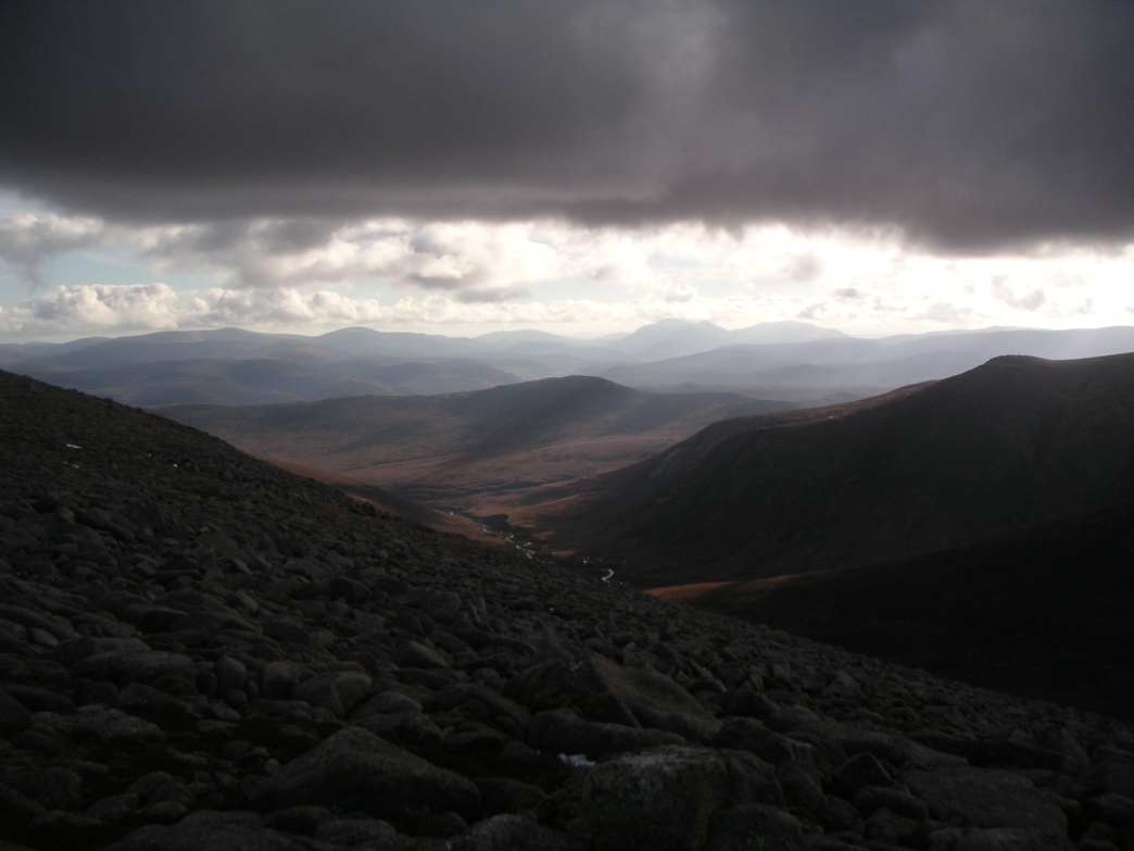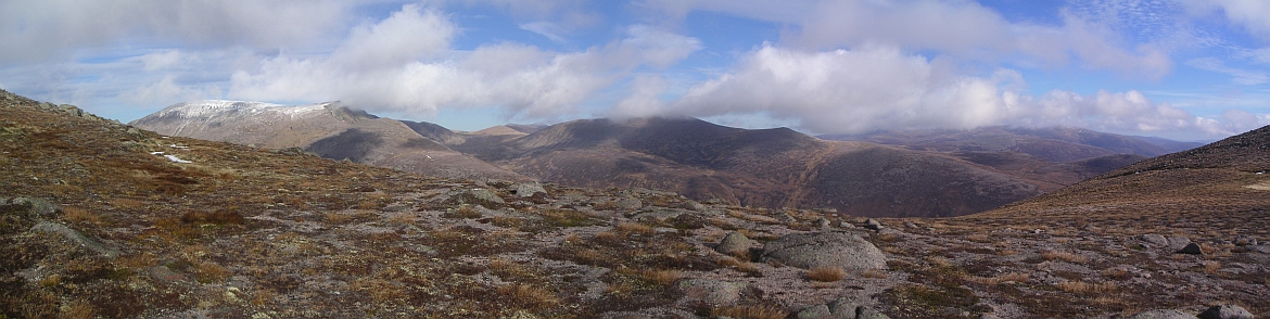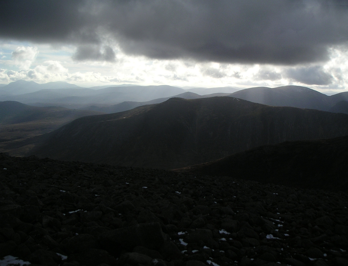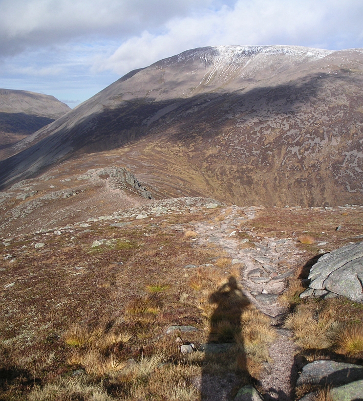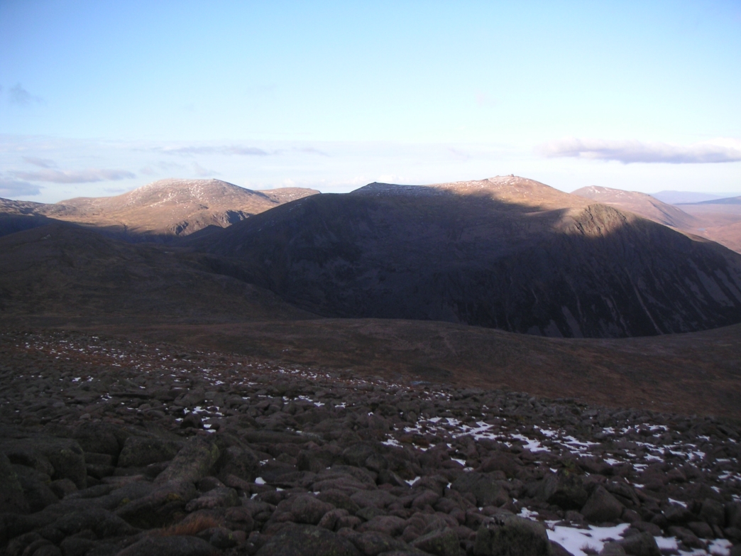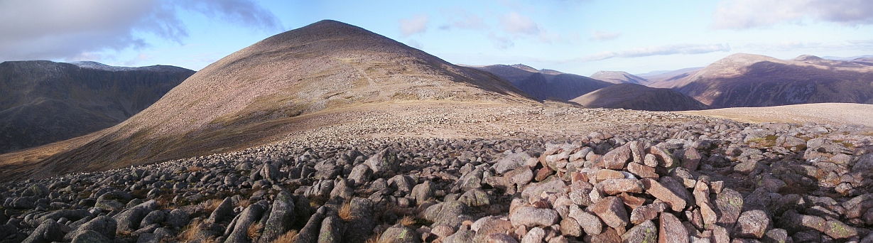 ![]() Part way up Ben Macdui (the second highest munro) with Carn a'Mhaim to the left, The Devil's Point in front of Beinn Bhrotain, Cairn Toul with Sgor an Lochain Uaine (The Angel's Peak) just peaking out. It is the fifth highest munro. |