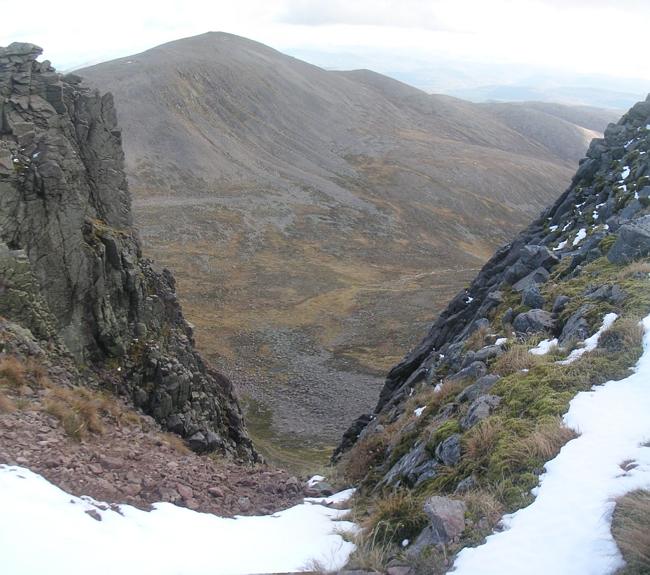 ![]() A chute in the cliffs at Coire Sputain Dearg, with Derry Cairngorm behind |
