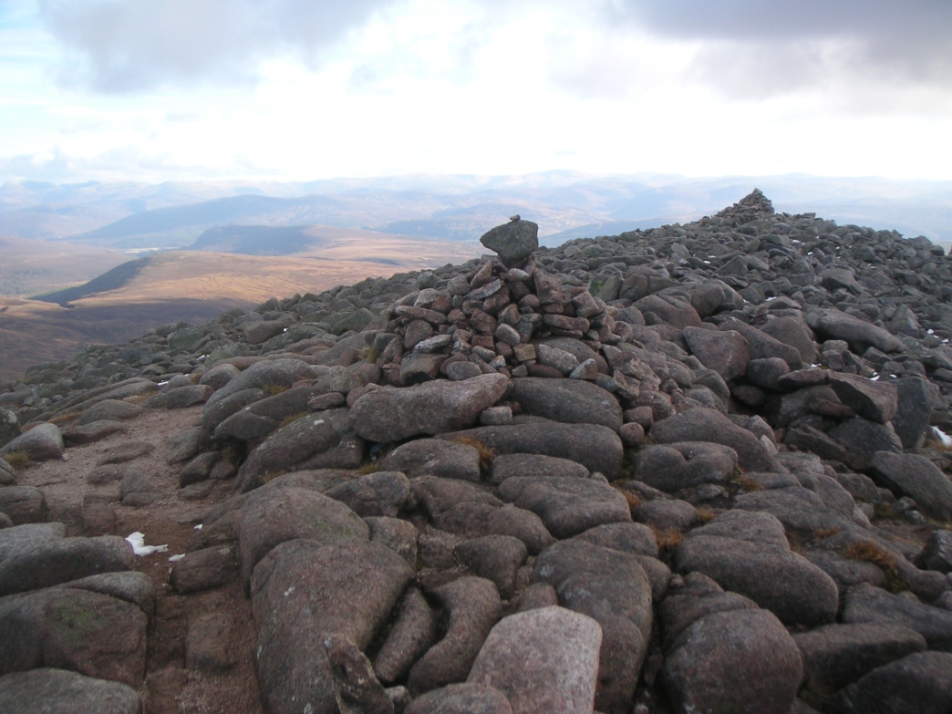 Big cairn, at Carn Crom at the end of the Derry Cairngorm ridge, looking up the shoulder of Carn a'Mhaim, with Monadh Mor behind. |
