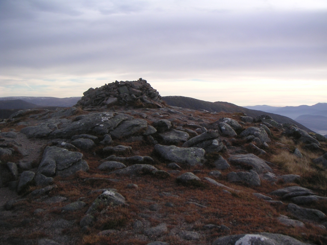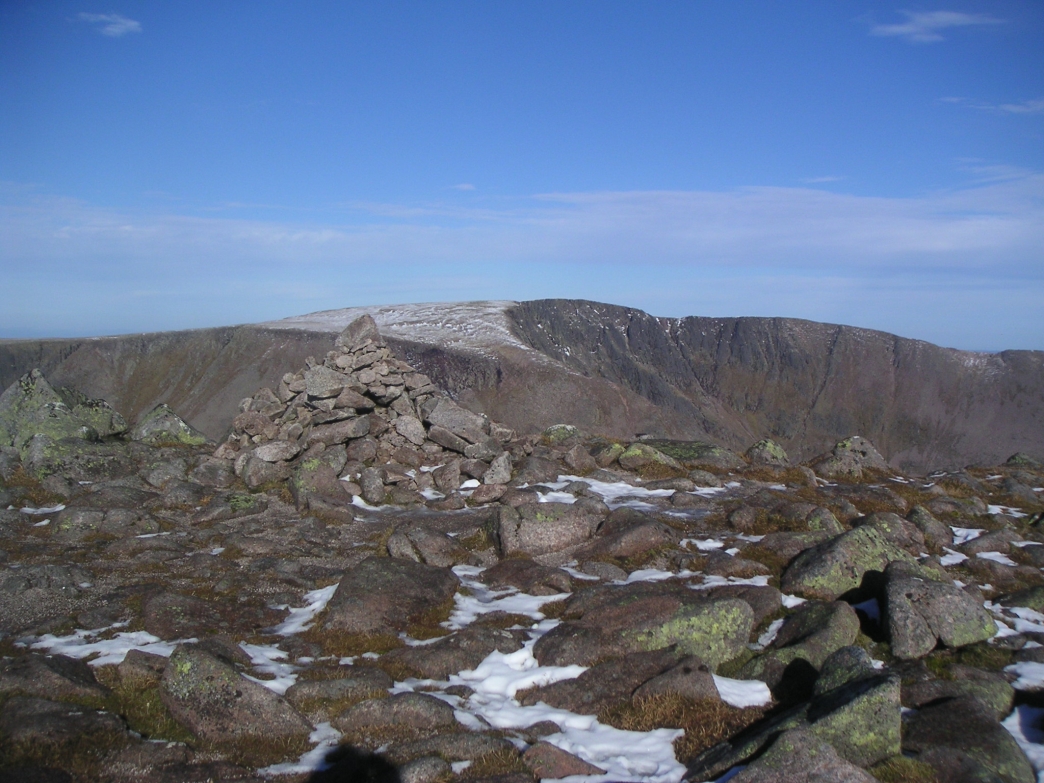 Sgor an Lochain Uaine summit cairn, with Braeriach behind |