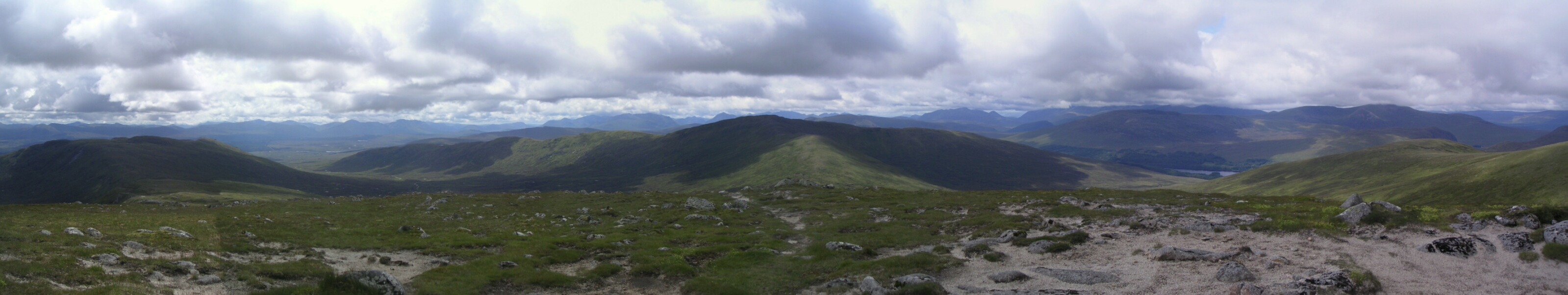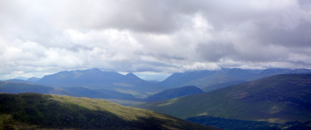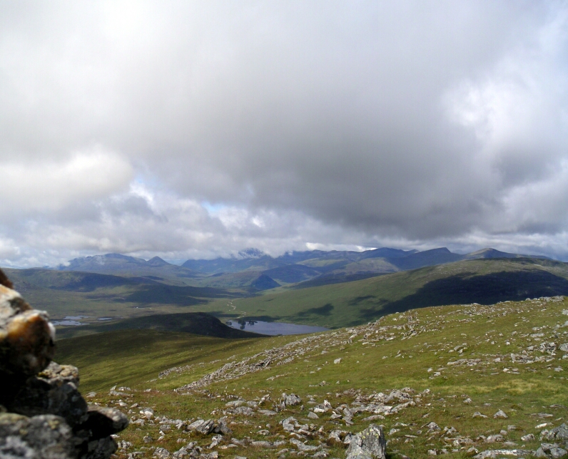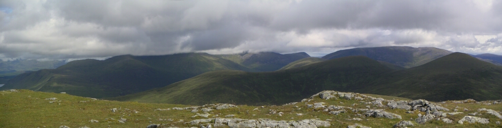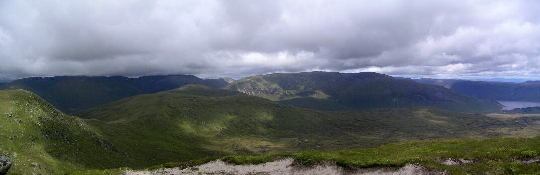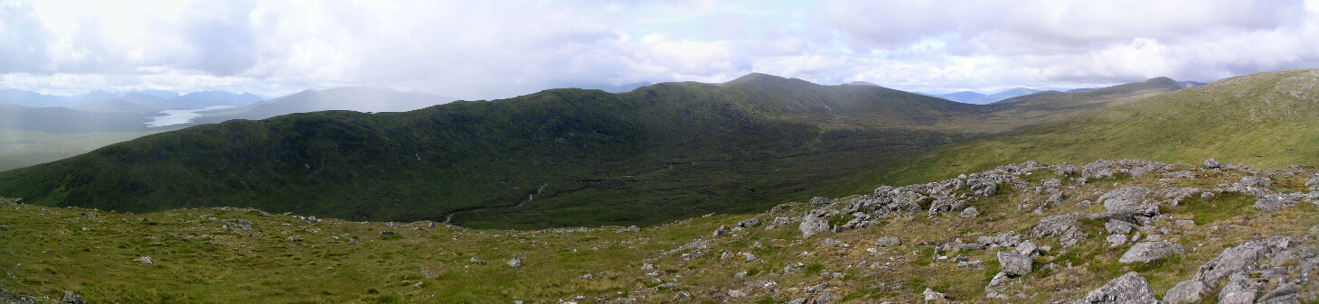 From the top of Sgor Gaibhre, Ben Alder on the right and the Anoach Beag range on the left. Loch Ericht just creeping in on the right. |