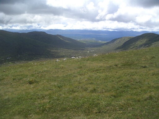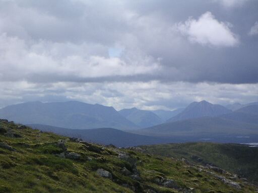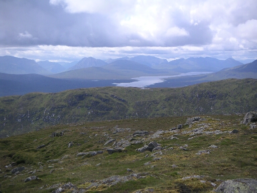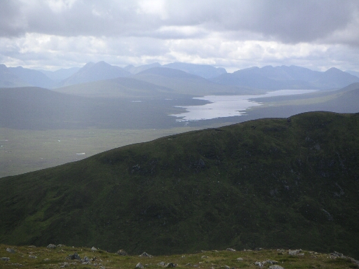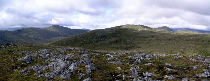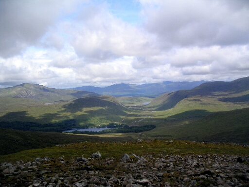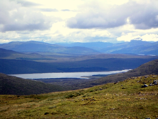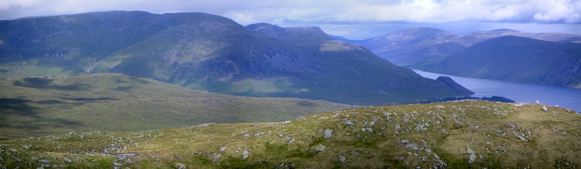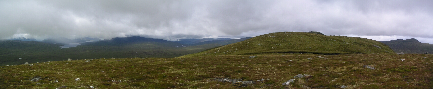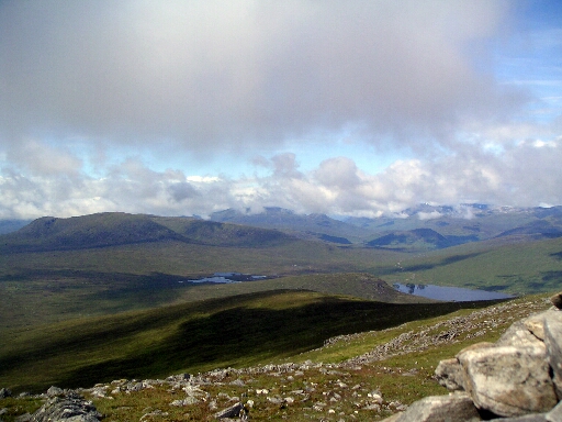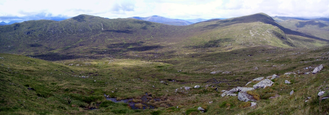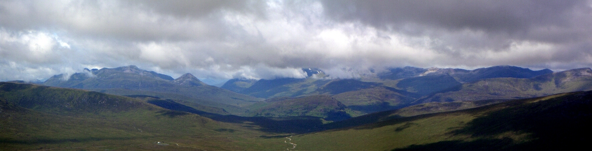 From the top of Sgor Gaibhre, Ben Alder on the right and the Anoach Beag range on the left. Loch Ericht just creeping in on the right. |