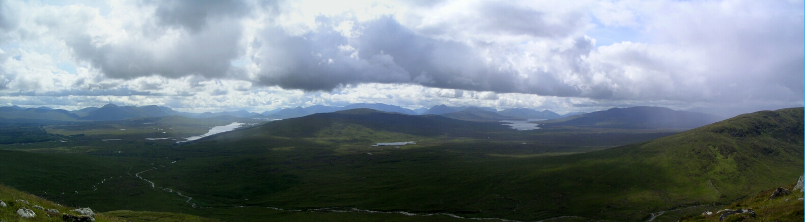 Now this is what I call a view. Wonderful. Loch Eigheach hidden on the left and behind that in the distance Stuchd an Lochan, then to the left of Loch Laidon we have Beinn a Chreachan and Beinn Achaladar, along to Stob Ghabar. Behind the Loch we have Creise and Buchalle Etive Mor on the right, then the Aonach Eagach behind the Blackwater Resevoir, then Mamores. I am sure I could see down Glen Etive at one point, but who knows? |