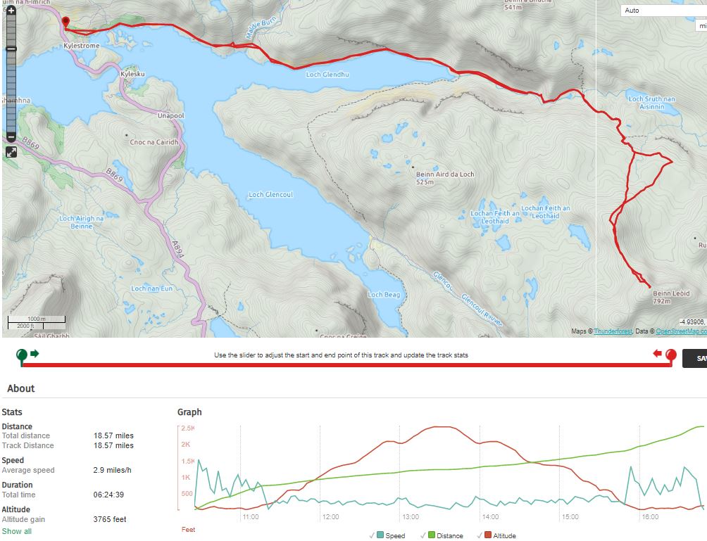 About 5 miles cycling up Loch Glendhu, past the bothy, then about 3.75 miles on foot to the top. Bit of a wander on the way back, but all good. |