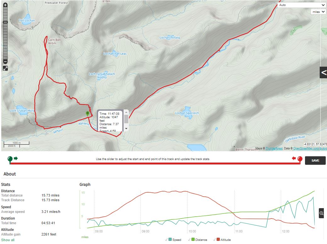 On foot from the start to the top and back to the tent (7 miles and 2007 feet of ascent), then half an hour to pack up, and a 9 mile cycle back (about 30 minutes quicker than the cycle up!) |