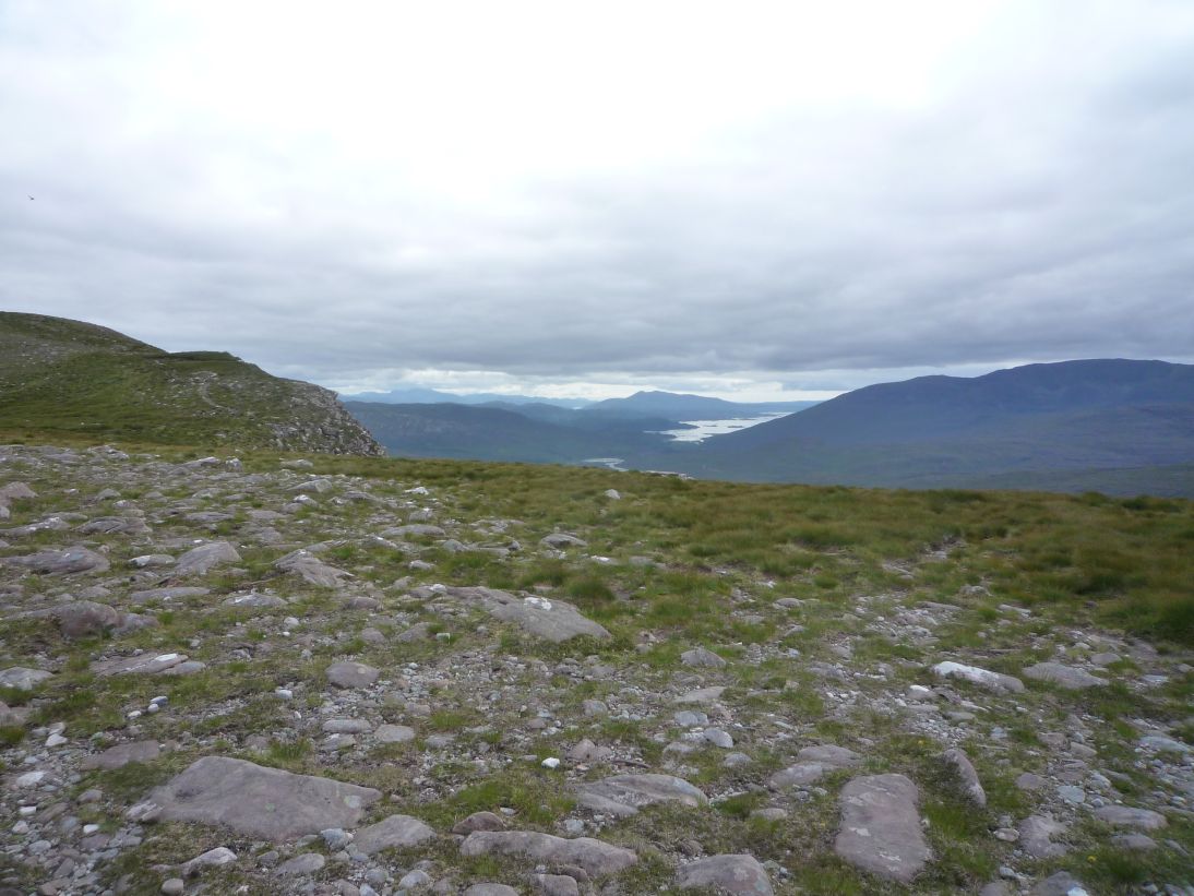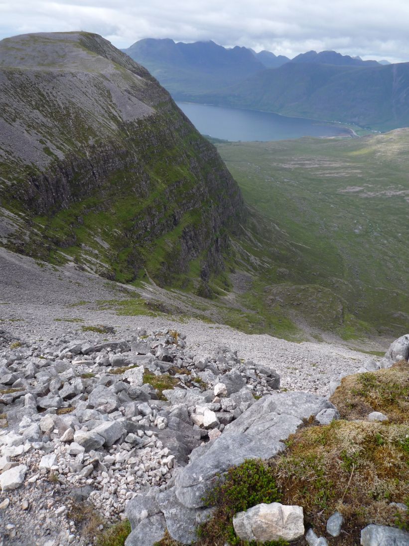 ![]() From the shoulder of 868 looking north west over Sgurr na Bana Mhoraire, with the route I followed on the way up to the right. Loch Damh on the left, and Loch Torridon heading out to sea. |