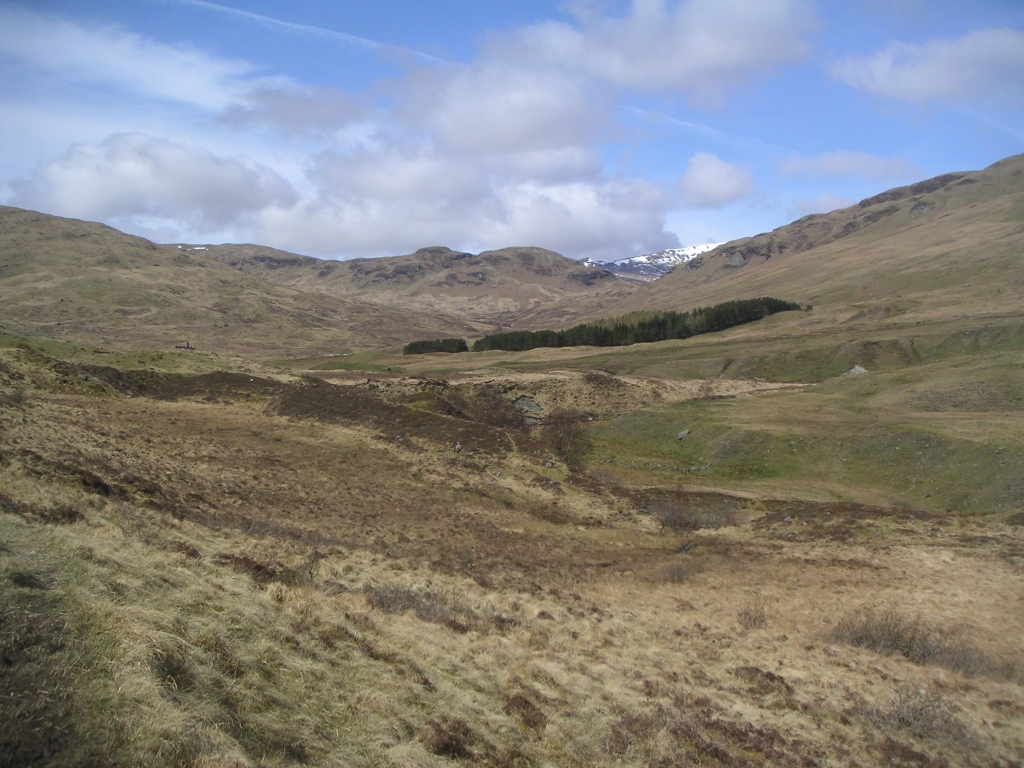 Reaching the top of the glen, with a snowy hill behind Ceann na Baintighearna, my route home. |