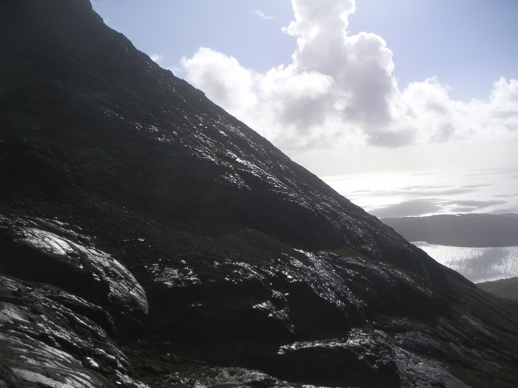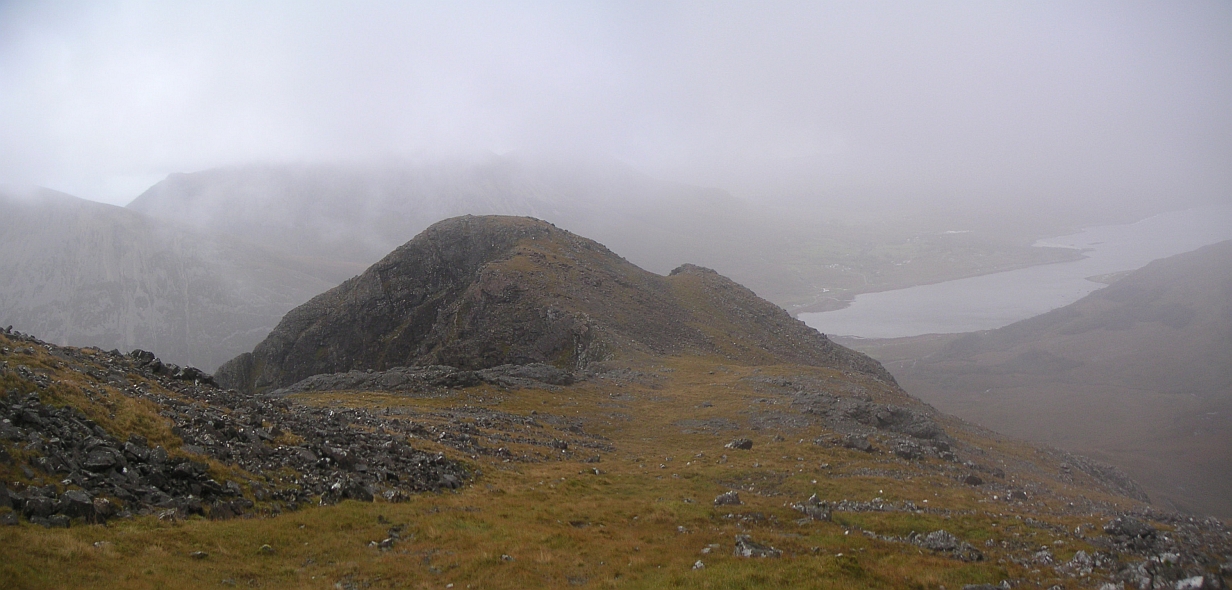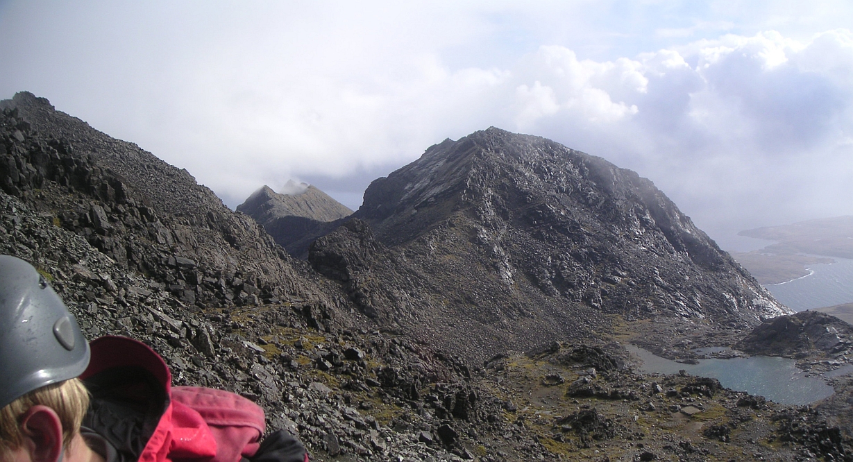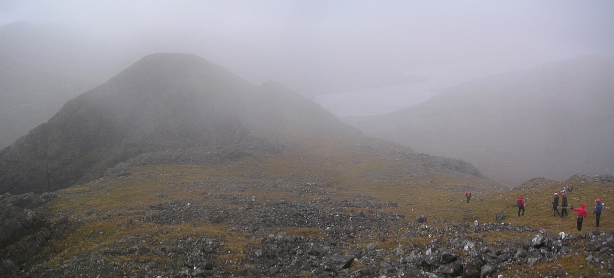 ![]() From part way up, looking back across Loch Coire a'Ghrunnda to our next hill, Sgurr Alasdair. Route up just to the left of the peak. Oh dear! |