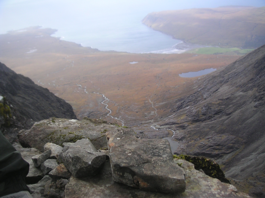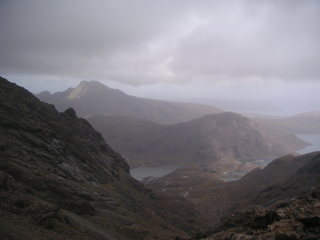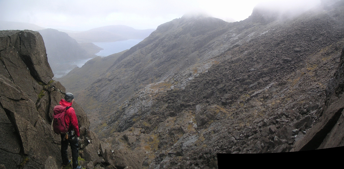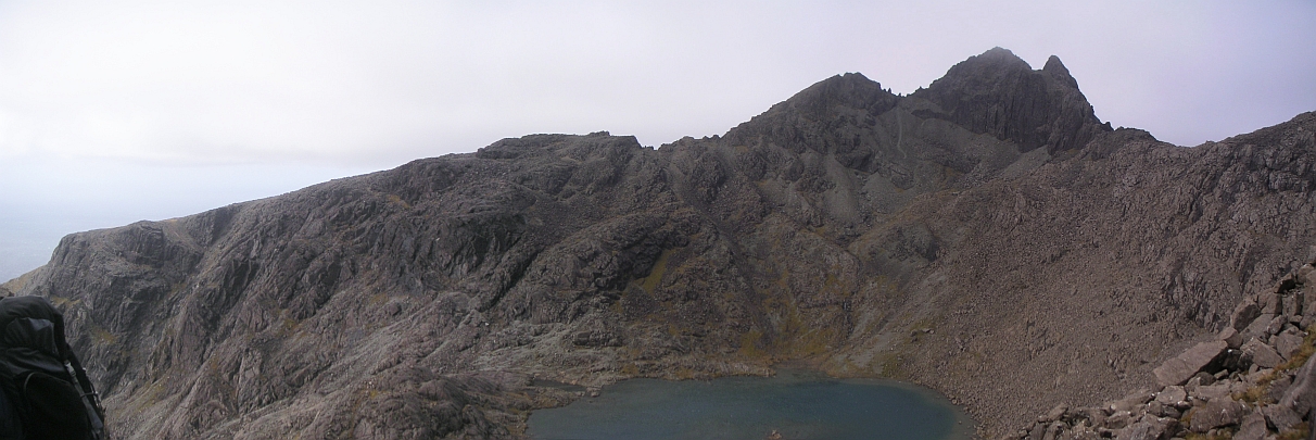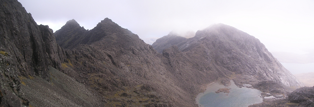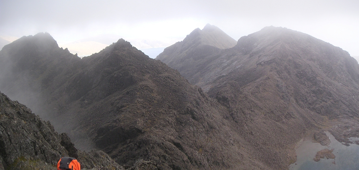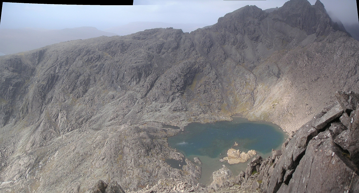 ![]() Wow, this is the stuff. Sgurr Dubh Mor on the left, Sgurr nan Eag on the right, and Loch Coir a'Ghrunnda way down there. |