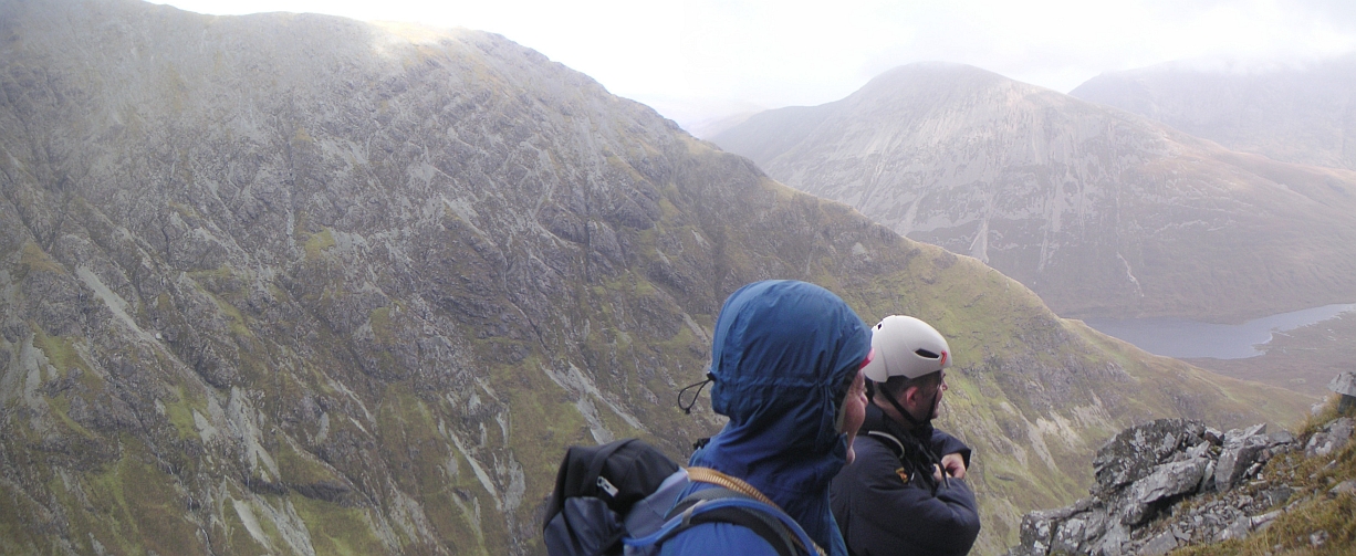 ![]() And at the top, holding on for dear life. Nice view of Sgurr Mhic Choinnich, the Great Stone Chute, and Sgurr Alasdair again. Norrie and John do technical rope stuff. |