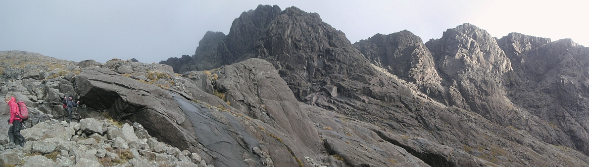 ![]() Near the top of the ridge, Sgurr Mhic Choinnich, Bealach Mich Choinnich, Sgurr Thearlaich, the Great Stone Chute, and the highest one is Sgurr Alasdair. |