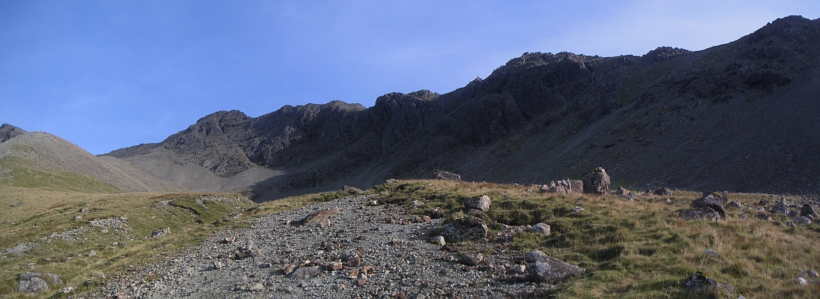![]() Getting closer, you can now see the scree leading up to An Dorus (the door) in the middle left, which is where I am headed. And on the right is the top of Sgurr na Banachdaich. Coire a'Ghreadaidh is very pleasant. |