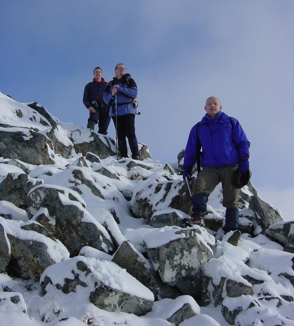 Top of Sgurr Fhuaran, munro number three, and either 3rd or 4th sister depending on how you count! We have just done all the horizon - Stuart helps to make up the numbers! |