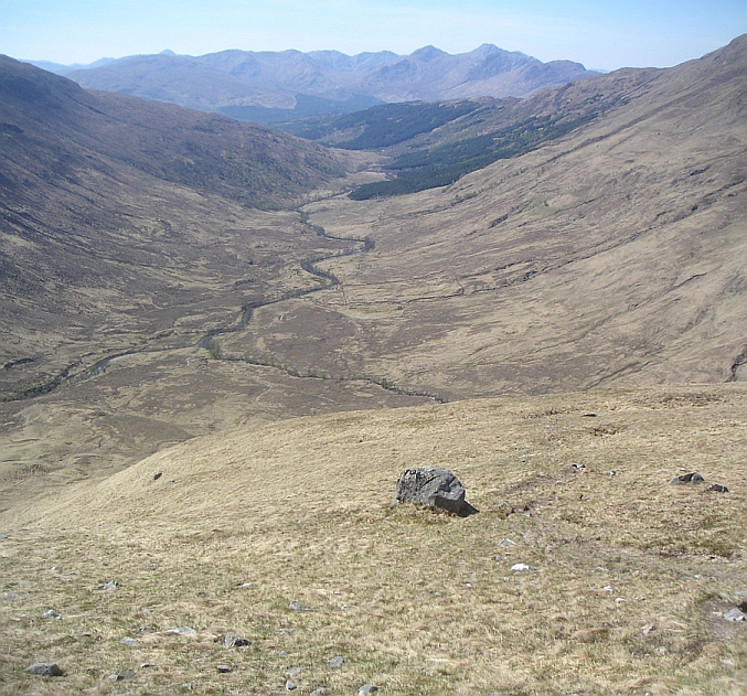 Time to leave the bike, some 6km up the track. Only another 4.5km to go. Looking back down Glen Fionnlighe. |
