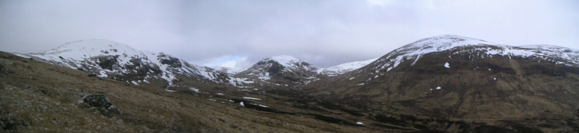 Carn Gorm on the left, then An Sgorr in the middle that we need to slip behind, then Carn Mairg on the right. Didn't get Meall nan Eun or the hill without a name, and didn't manage to climb them anyway!