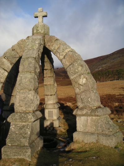 Queen's Well, and behind that the track up the Ladder burn |