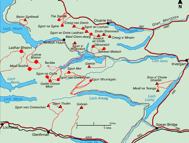 | Sgurr nan Coireachan, Garbh Chioch Mhor and Sgurr na Ciche. | Canoe Loch Quoich and climb hills | 17 to 19/6/05 | DC, MC, CM |