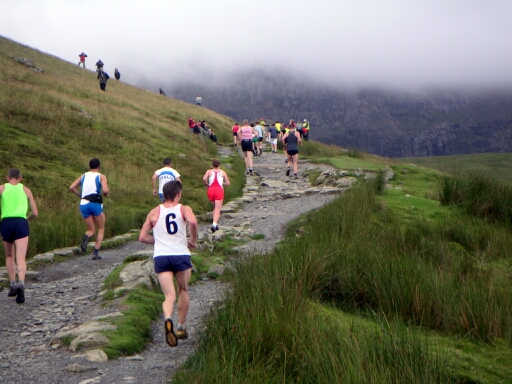 Mad buggers. Annual Snowon Race. Up in 42 minutes, down in 26. And I was expected to get out of their way! Actually one of them dropped dead before getting to the summit! |