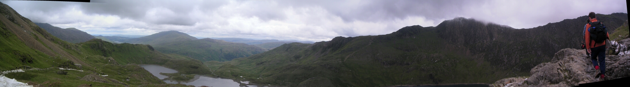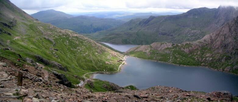 If only I could do those panorama things. - path I have come up on the left, Llyn Llydaw down there, and the Miners path I had intended going home in crossing the water and heading off down the hill in the middle. Snowdown to the right, and the path up.