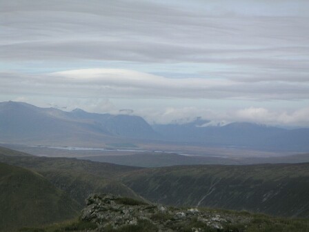 Look to the North West - Rannoch Moor, from left to right that must be Stob Ghabar, Creise, Buchaille Etive Mor, and Glen Coe. Kingshouse is down there somewhere too. Brill. |